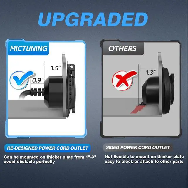 Re-design of power cord outlet located in the center of the back, can be mounted on thicker plate, avoid obstacle perfectly. AC Port Plug great for a car, boat, marine, truck, trailer, pickup, RV, etc.