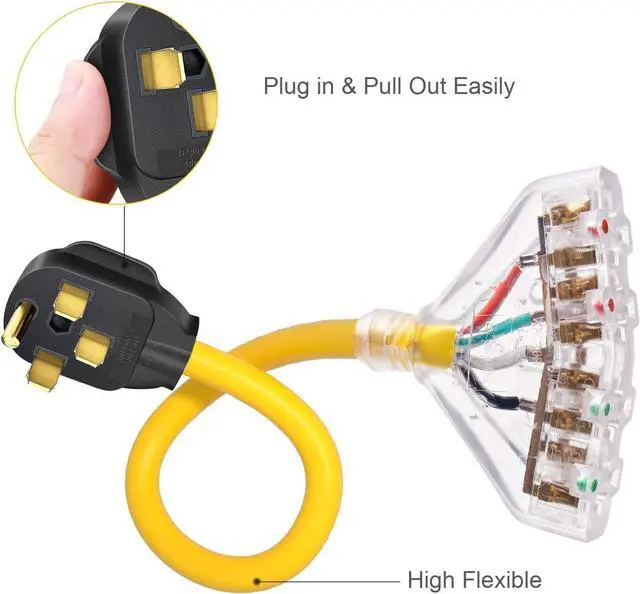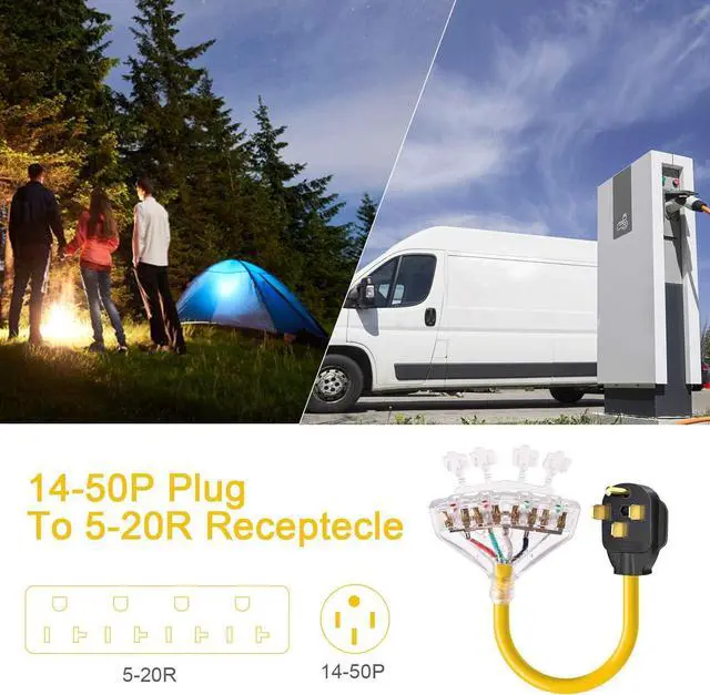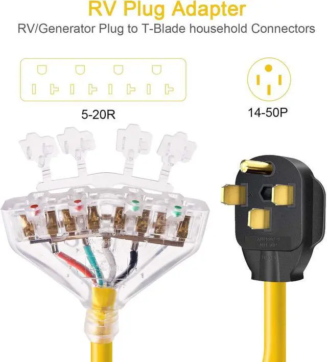 RV ADAPTER CORD: NEMA 14-50P male plug into RV or generator power socket, 4X 5-20R T-Blade household Connectors are used fo most household tools and electrical appliances, very suitable for distributes temporary power at job site or campsite.