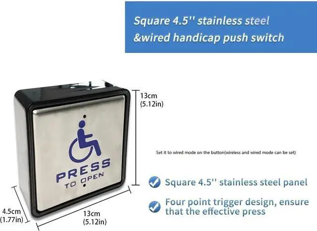 Four point trigger design, ensure that the effective press Large capacity output, can be used with automatic door, electric lock and access control Square stainless steel push panel,durable and easy to clean