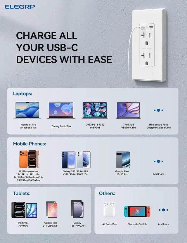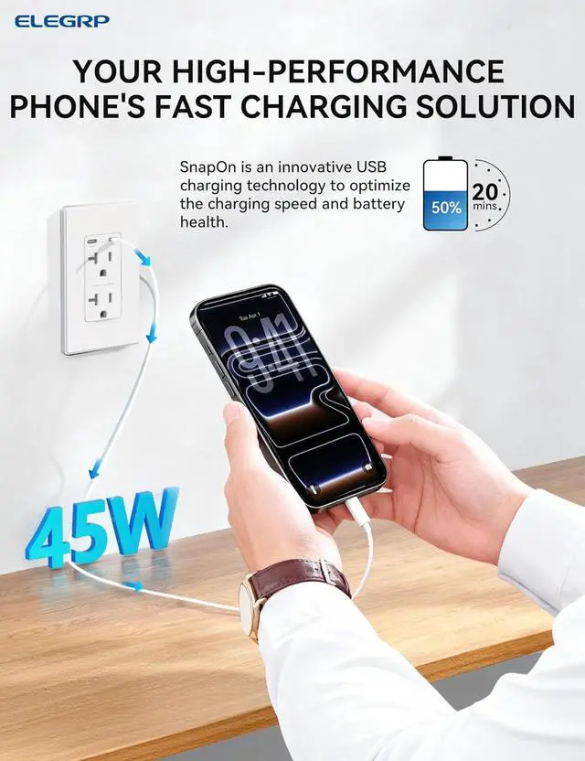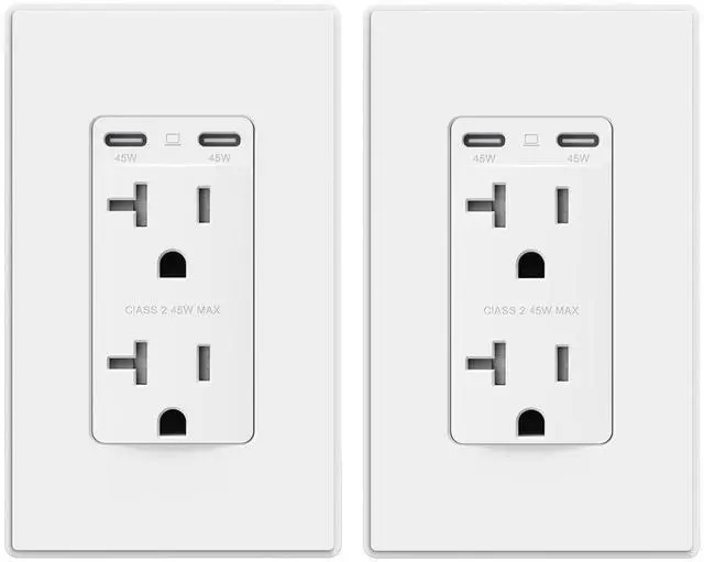 ELEGRP 45W Ultra-Speed USB C Outlet, 20 Amp Dual Type-C TR Wall Outlet Receptacle, Charging Power Outlet for iPhone 17 Series & More, UL Listed, 2 Pack, Matte White