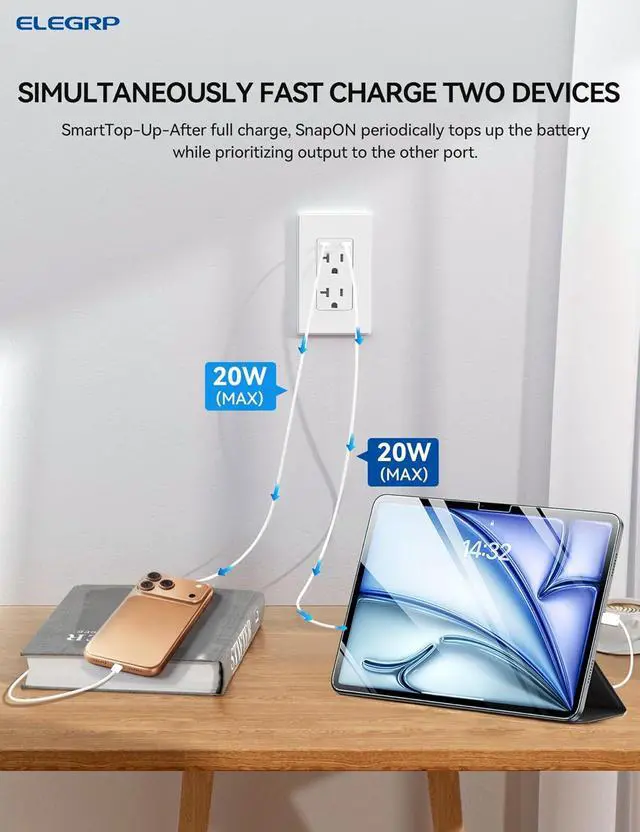 Dual USB-C PortsDual 20W Fast Charging When Both Ports Are Used, Charge two devices at once with 20W + 20W PD output, ideal for simultaneously powering two iPhones, two Android phones, or a mix of phones and accessories without sacrificing speed.