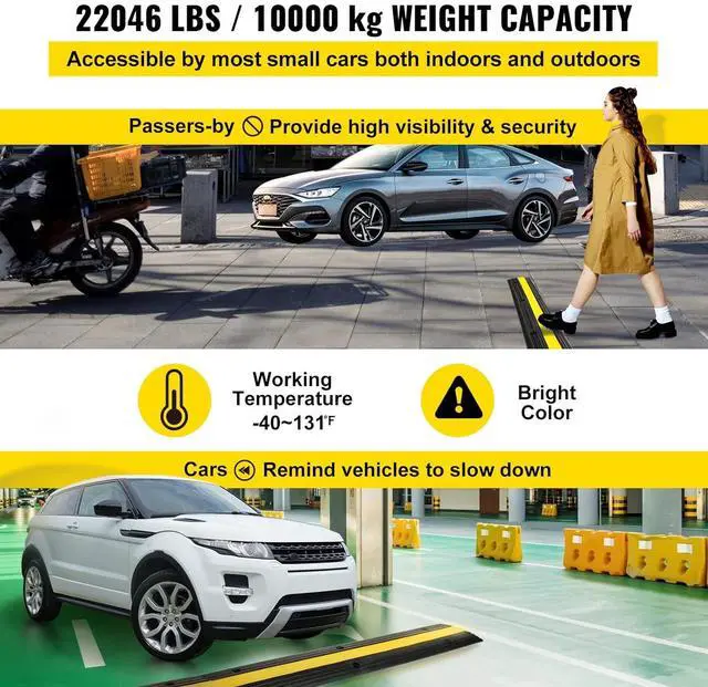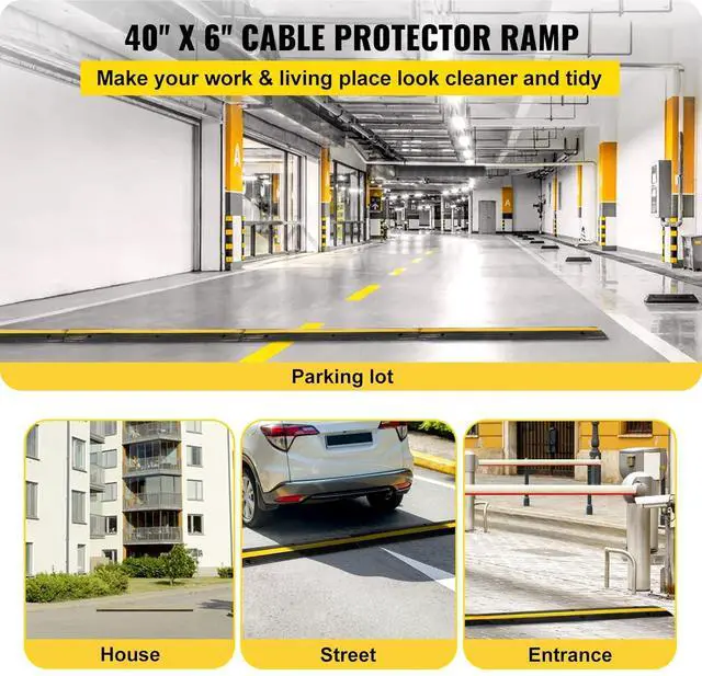 This cable ramp is designed to control traffic speed and provide enough room for road cables while not causing damage to cars or roads. It adopts high-quality rubber construction, PVC cover for long-term service, 22046 lbs/ 10000 kg load capacity, and is secure on use at night.