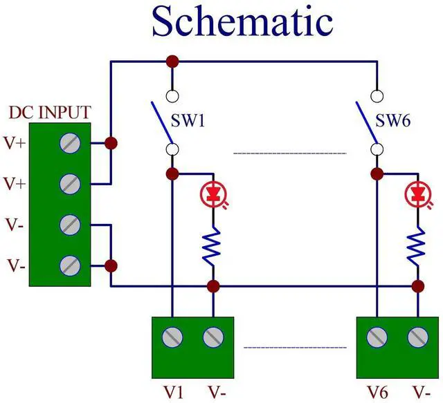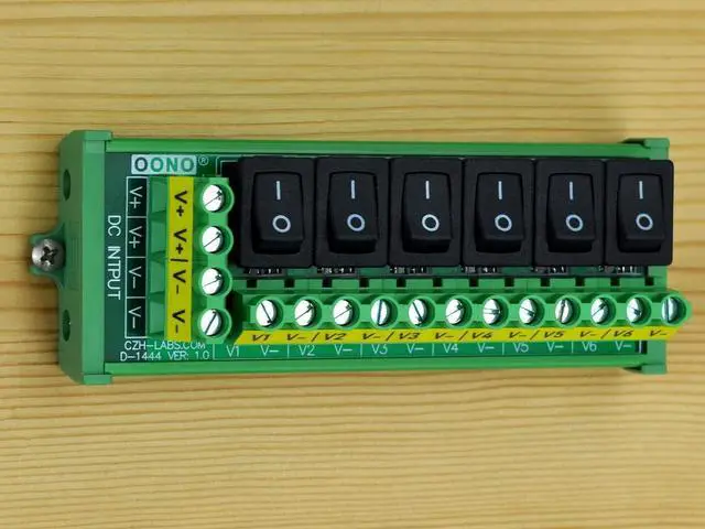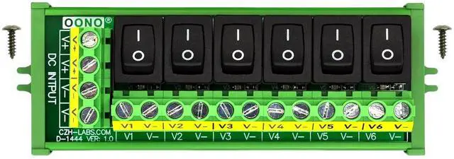 1, Working voltage DC 0 to 50V. Maximum total input current 30 Amps. 6 Channels output, each channel maximum output current 10 Amps.