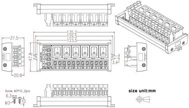 2, Input terminals pitch 7.62mm/0.3 inch, maximum current 30 Amps for per position, wire size 26 to 10 AWG, stripping length 8mm, Metric M3 slotted screw. Support power supply expansion connect to other modules.