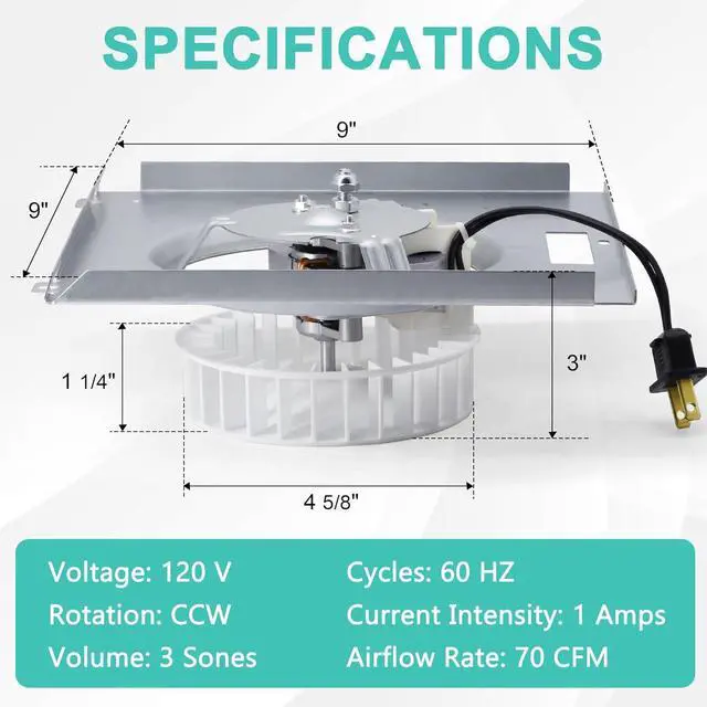 Premium Quality - The bathroom fan motor is constructed with a sturdy steel housing for long service life, while the high quality polymeric blower wheel and standard polyester fiber two-pronged plug shell provide good frictional resistance and excellent insulation properties