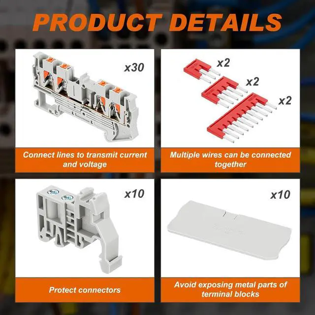 What You Will Get: the package comes with 30 pieces of ST2-2.5/2X2 terminal blocks, 10 pieces of covers, 10 pieces of end stops, 2 pieces each of jumpers (3 pole, 5 pole, 10 pole), a complete set to meet your needs