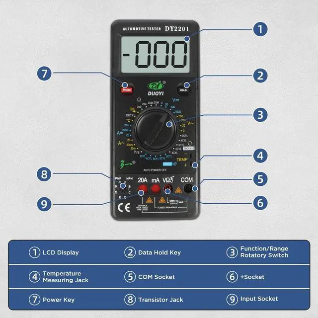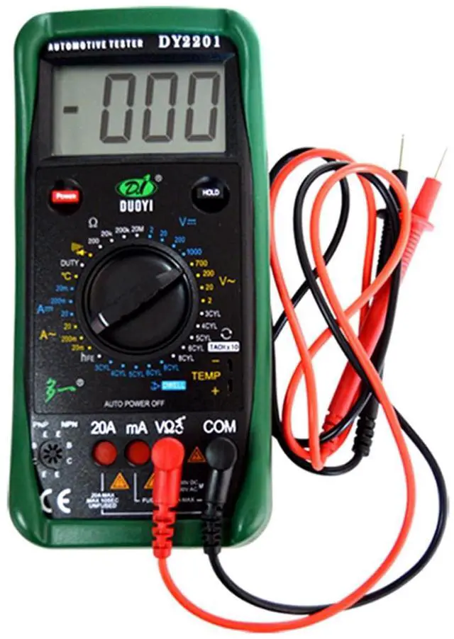 Measure DC voltage and current, AC voltage and current, resistance, Duty ratio, temperature, diode transistor, continuity, dwell angle of automobile distributor contact, and motor speed