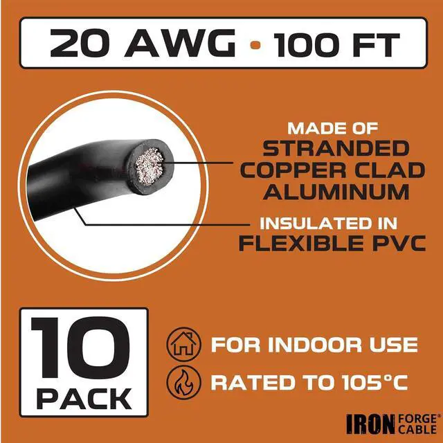HANDLES EXTREME HEAT - Rated to 105°C. 100 feet of 20 guage wire per roll. Stranded copper clad aluminum. Do not use for building/household 110 / 220 V AC wiring.
