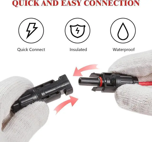 QUICK AND EASY CONNECTION: MHPOWOS solar extension cable can help you to position your solar panels anywhere with ease and flexibility. The solar connector is plug-and-play. Press fingers to either side of the built-in lock on the male connector can connect and disconnect the connector easily, without using other tools.
