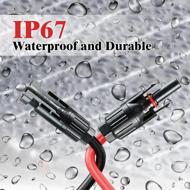 WATERPROOF AND DURABLE: An IP67 waterproof ring on the male solar connector is perfect for sealing out water and dust to prevent corrosion. The connector is stable and safe with the built-in lock, which is durable outdoors. The PV cable is designed to withstand extreme heat and cold.