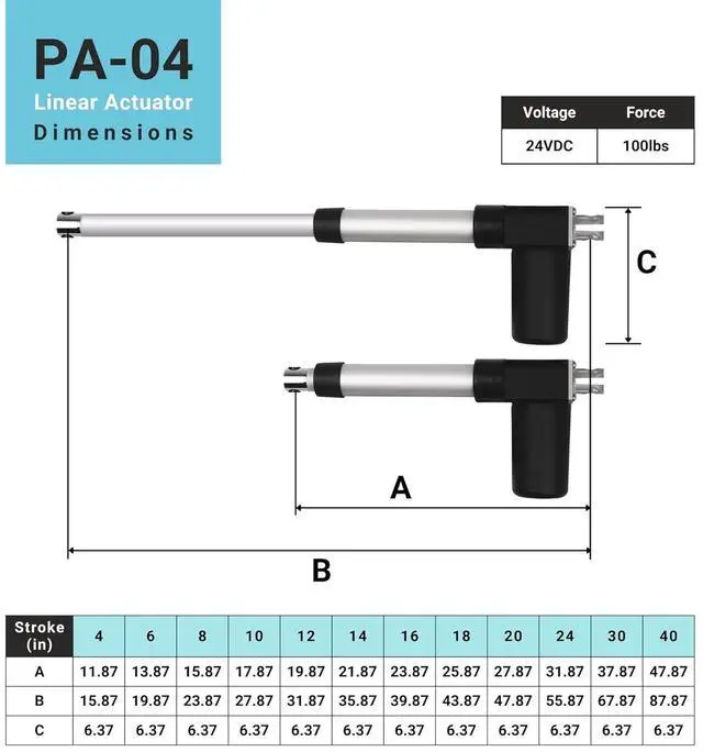 Compatibility Options: The PA-04 linear actuator features a standard 2-Pin Molex Mini-Fit Jr connector, simplifying installation and integration into existing systems