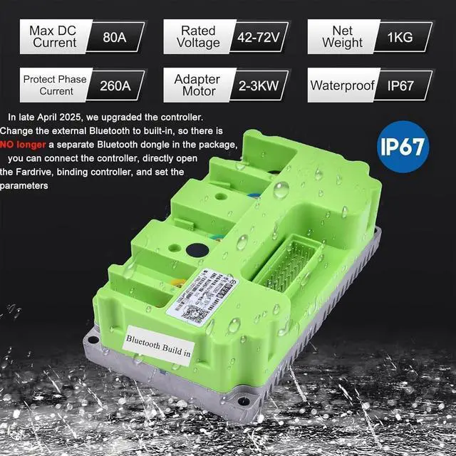 ND72260(KR72260) are sine wave controller with waterproofing grade IP67, suit for 2-3kw Brushless motors Hall. Rated Voltage 72V,the peak voltage is 88V, it suitable for 48-72V , rated power: 3KW, Max DC Current 80A, Phase current 260A, Net Weight 1KG, Its hall version (as default) which suit with hall motors.