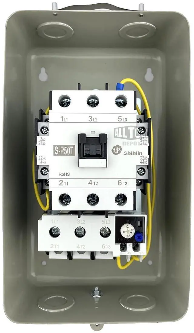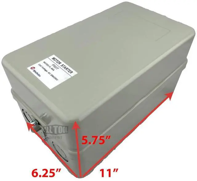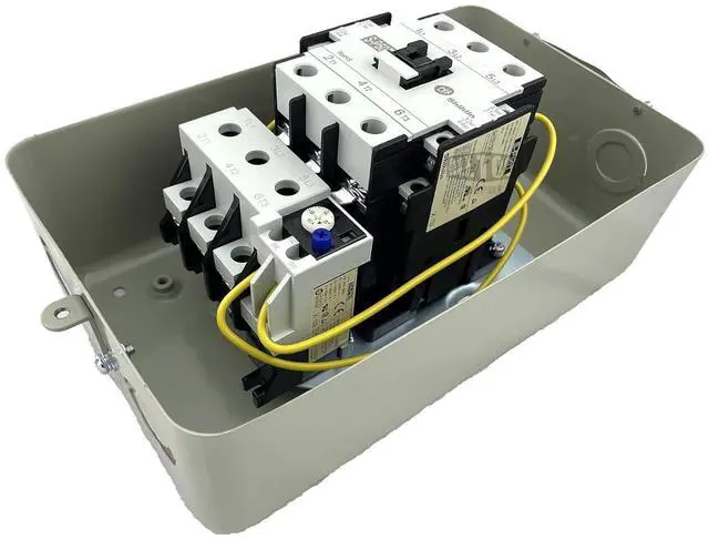 "PROFESSIONAL INSTALLATION IS REQUIRED" Brand New 15HP Three Phase Magnetic Motor Starter. Complete With Adjustable Overload Relay The Range Is Between 43-65 Amps. Also Comes With Built In Side Mounted Auxiliary Contacts. Normally Open & Normally Closed Type. Starter Comes Complete In A Metal NEMA 1 Style Enclosure, In Addition To 4 Punch Outs For Incoming And Outgoing Wires. Manufacturer Has Supplied 4 Rubber Grommets For Wire Protection. Reset Button Located On The Overload. Reset Can Be Set To Manual Or Auto Reset. HP: 15/ Voltage: 208-230vac/ Amps: 65 Amp/ Contactor Phase: Three/ Enclosure: Metal NEMA 1 Enclosure/ Dimensions: 11" Tall 6.25" Wide 5.75" Depth/ Overload: Amperage 43-65 Amps.