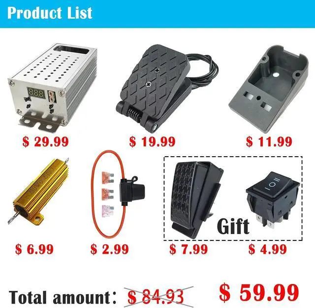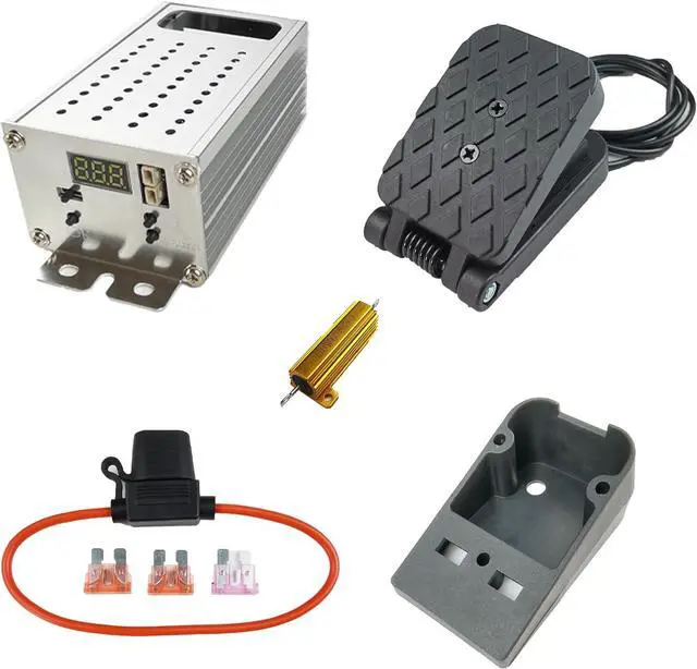This kit includes the PWM2.0B module, a variable speed pedal, installation accessories for the variable speed pedal, a braking resistor, a fuse, and a brake pedal. It contains most of the kits for upgrading power wheels