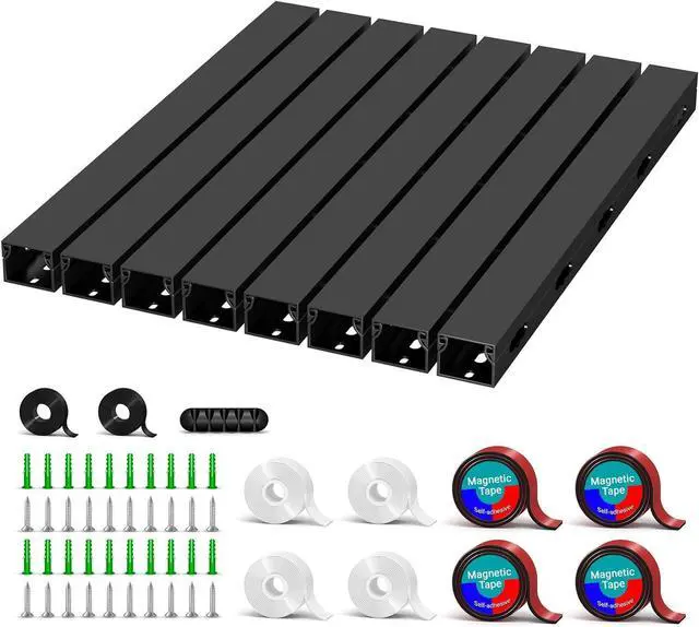 COMPLETE KIT - Includes 8 cable cover raceways (15.7"x1.4"x1.2" each), 125.6" magnetic accessories, double sided adhesive tape, screws. Full Cable Management solution