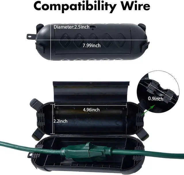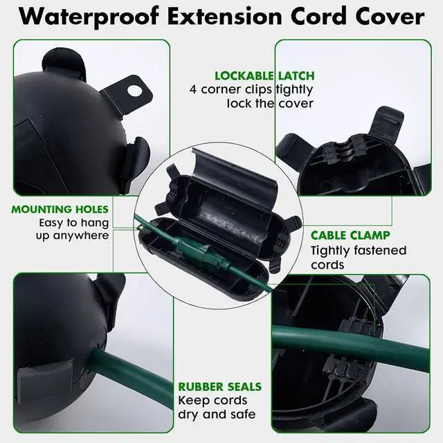 Waterproof Design: Features high-quality sealing materials to keep extension cord connections dry in rainy and snowy weather, preventing moisture-induced short circuits and damage. Designed to seal 12/14/16 gauge outdoor extension cord, braided cable, and flat wire. Each outdoor extension cord cover includes 4 buckles ensure a tight closure.