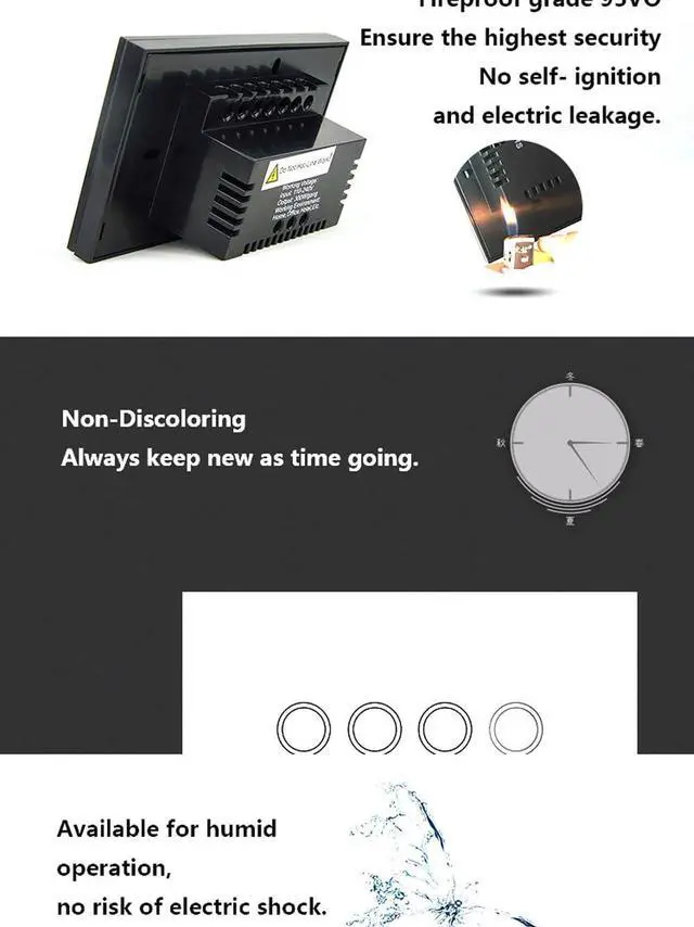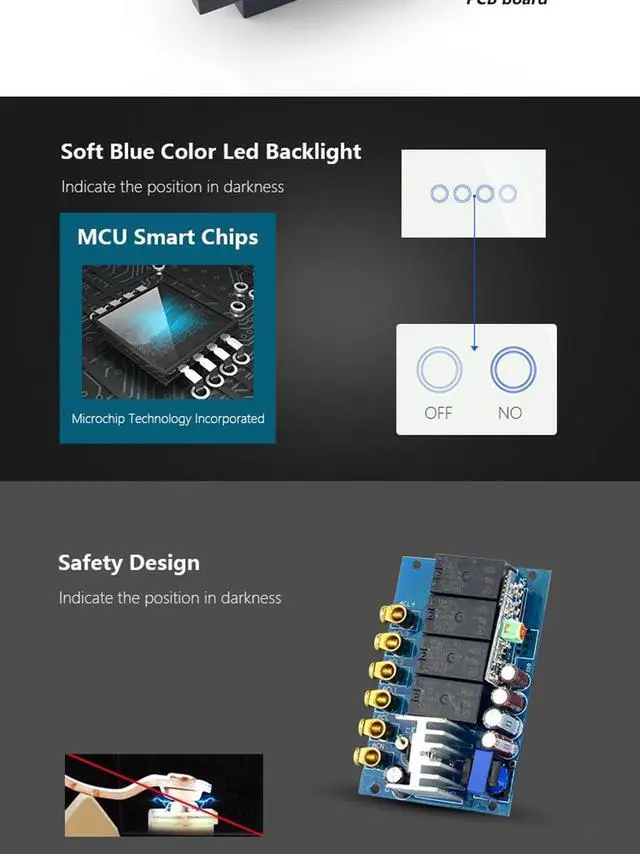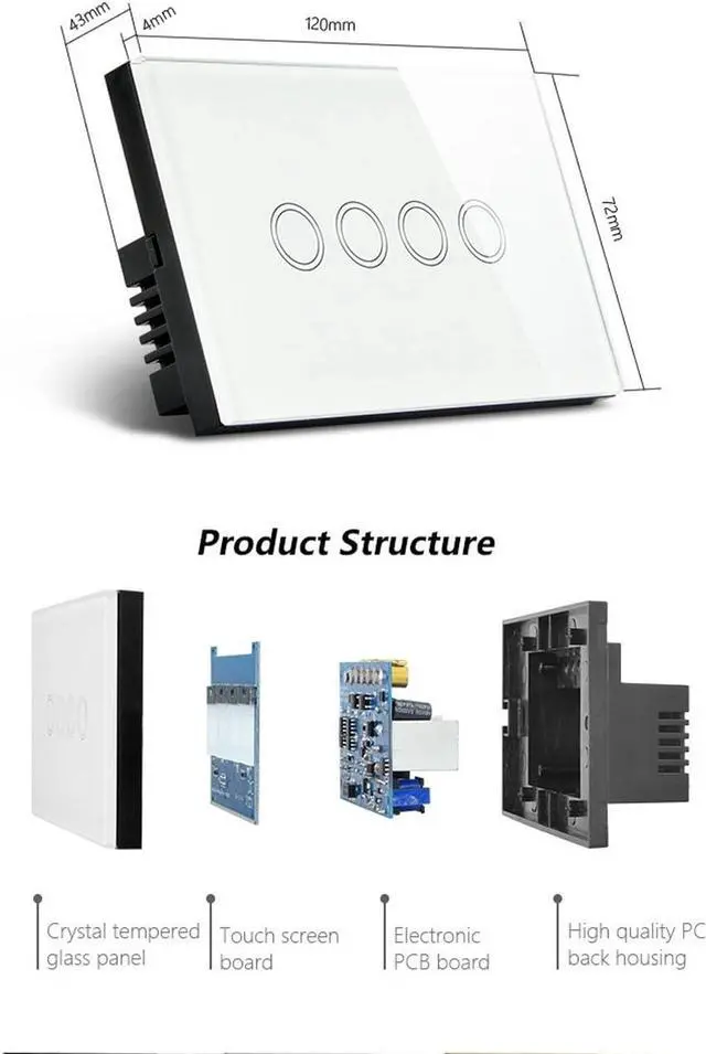 More humanization design: the lamp is off when the incoming of electricity again, save electricity. Silent touch, keep your home or office silence. Single live wire control, easy to install, replace the old switch directly.