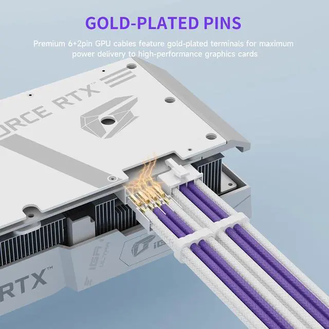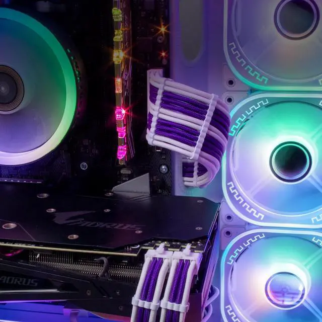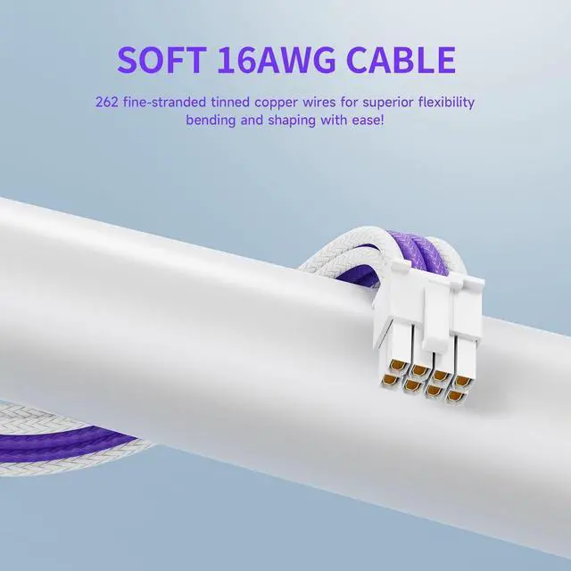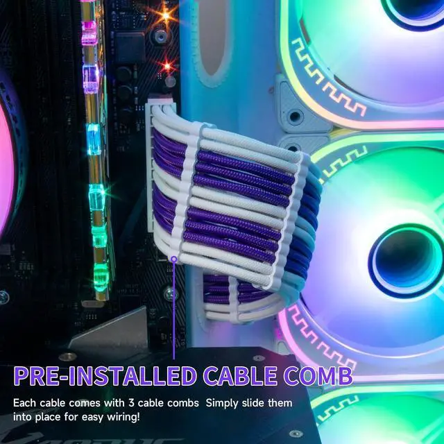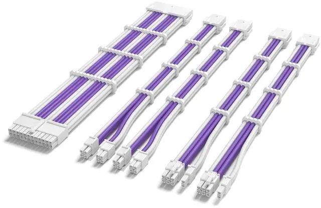 Premium Sleeved PC Cable ExtensionWoven with bright white and purple PET material,more heat-resistant than cotton mesh,will not cause heat shrinkage,PET fiber is also more robust,maintaining better durability while the color is more vibrant,match well with very color computer case,achieve better chassis appearance by extending the original module cable or power supply cables.The best PC parts to meet the requirements of high-end gamers or computer DIY enthusiasts