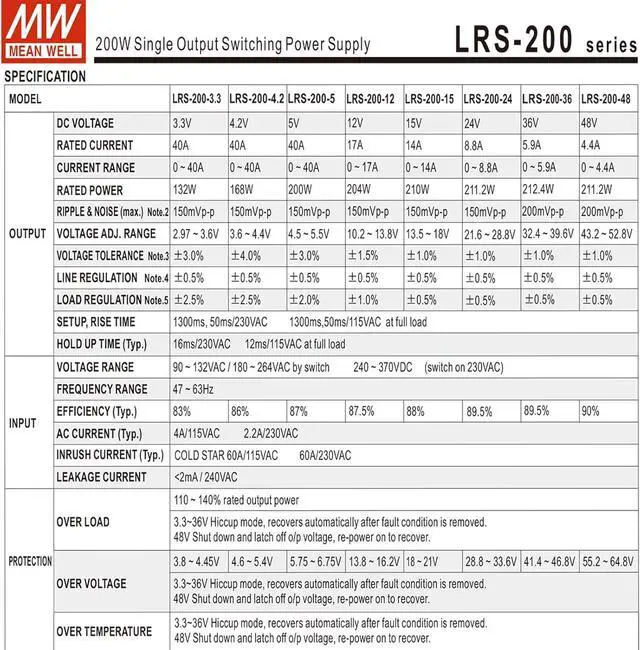 AC input range selectable by switch Withstand 300VAC surge input for 5 second Protections: Short circuit / Overload / Over voltage / Over temperature Cooling by free air convection 1U low profile