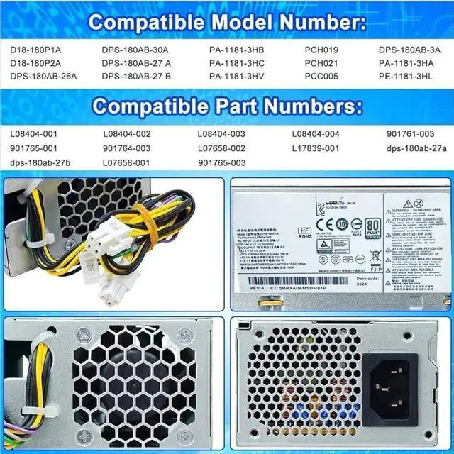 [FULL REPLACEMENT POWER ADAPTER] 180W metal power adapter in silver, compatible with 280 G3 and 400 SFF desktops and listed under part numbers PA-1181-3HB, L07658-001 and L08404-002, intended for maintenance and system refresh.