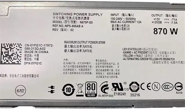 N870P-S0 A870P-00 0YFG1C 870W 12V 71A for R710 Server Power Supply NPS-885AB A YFG1C 7NVX8 07NVX8