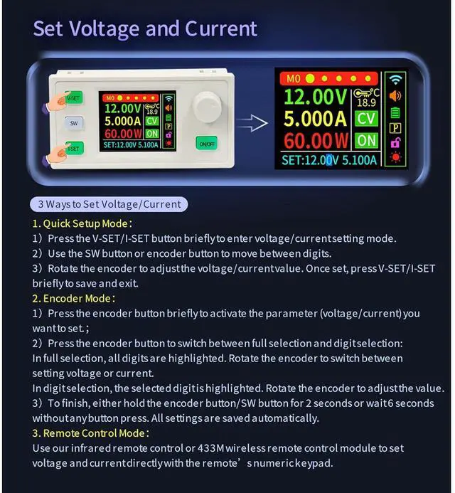 Features 6 36V input ranges, 0 36V adjustable output, 88% efficiency, 10 memory presets, and multiple protections for safe, stable power regulation
