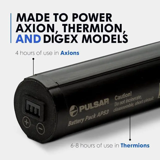 Power your favorite thermal and digital night vision devices with the APS3 Battery Pack. With a 3.6 charge voltage, the APS 3 battery pack holds a battery life of up to 4 hours in Axions and 8 hours in Thermions. The lithium-ion battery comes complete with a charging station with battery charge indication and is designed to fit the Axion Thermal Monocular and Thermion Thermal Riflescope.