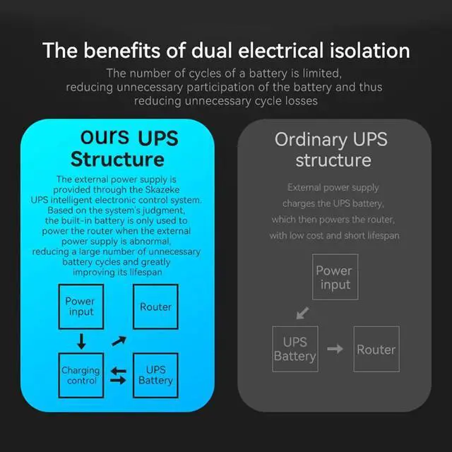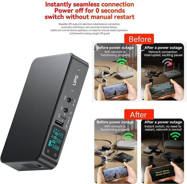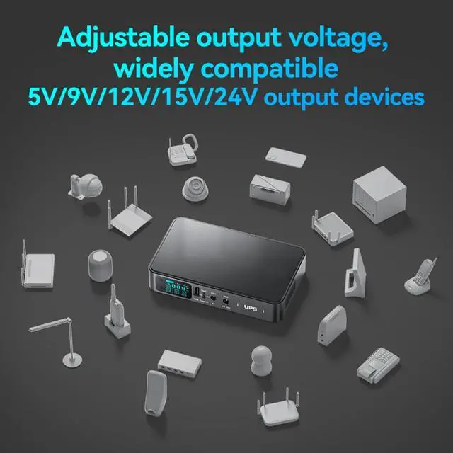 Can be used during power outage, also can be used for outdoor activity for router, monitors, speakers, LED lights, cellphones, tablets.