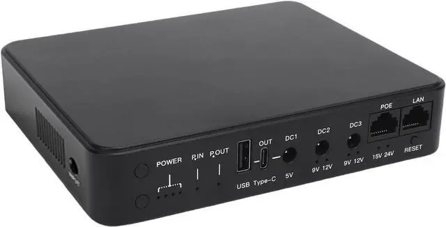 3. Multiple ports: UPS has several output specifications, including 5V 3.6A CC, 9V 12V 2A, Type C 5V 3.6a, 15V 1.3A, 24V 0.8A, and one RJ45 port at a speed of 100 Mbps. Compatible with various devices, such as digital printing machine, security monitoring, access control, camera, portable DVD.