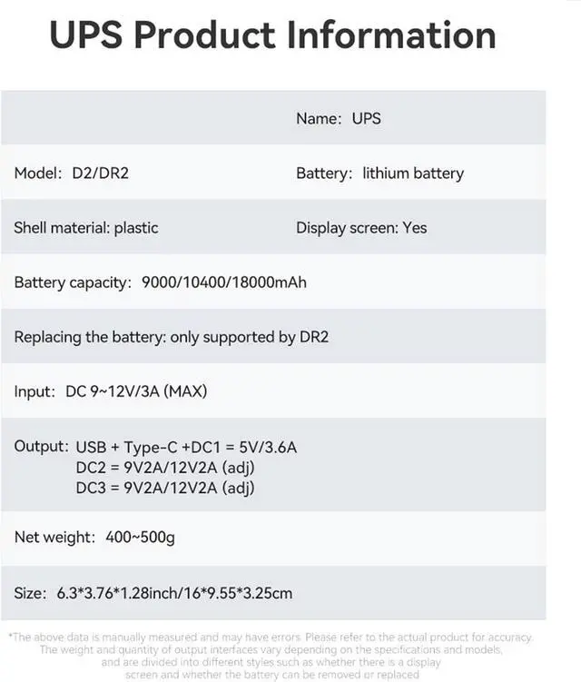Suitable for reliability, this uninterruptible power supply features multiple outputs (5V3.60A, 9V2A, 12V2A) and USB+USB C port, ensuring stable power for wide electronics from routers to smartphones.