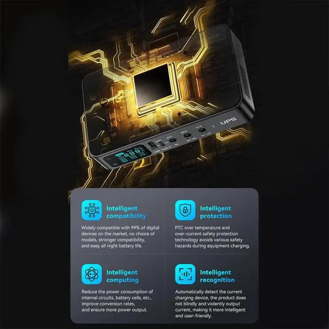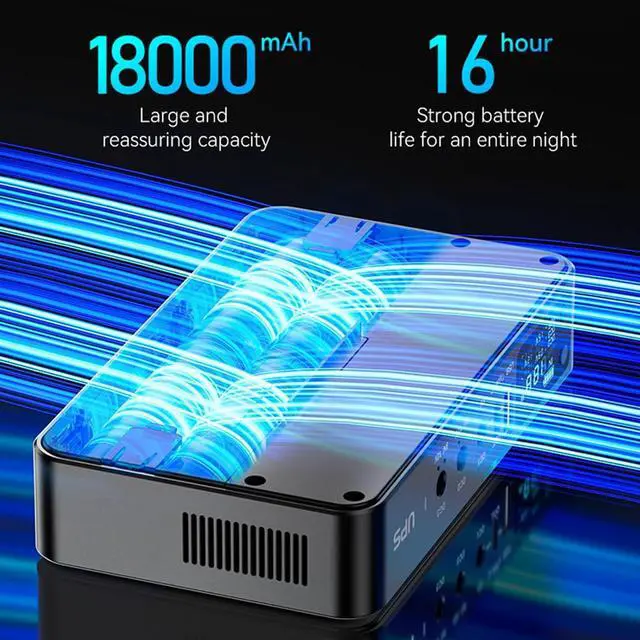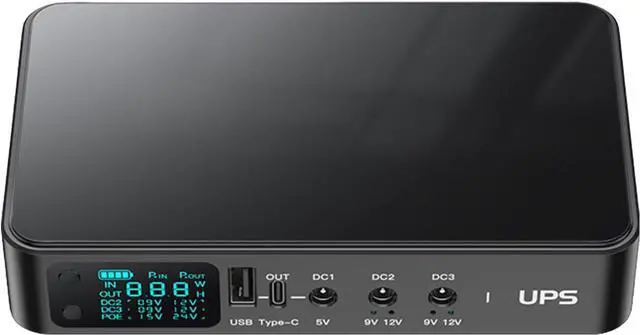 Suitable for reliability, this uninterruptible power supply features multiple outputs (5V3.60A, 9V2A, 12V2A) and USB+USB C port, ensuring stable power for wide electronics from routers to smartphones.