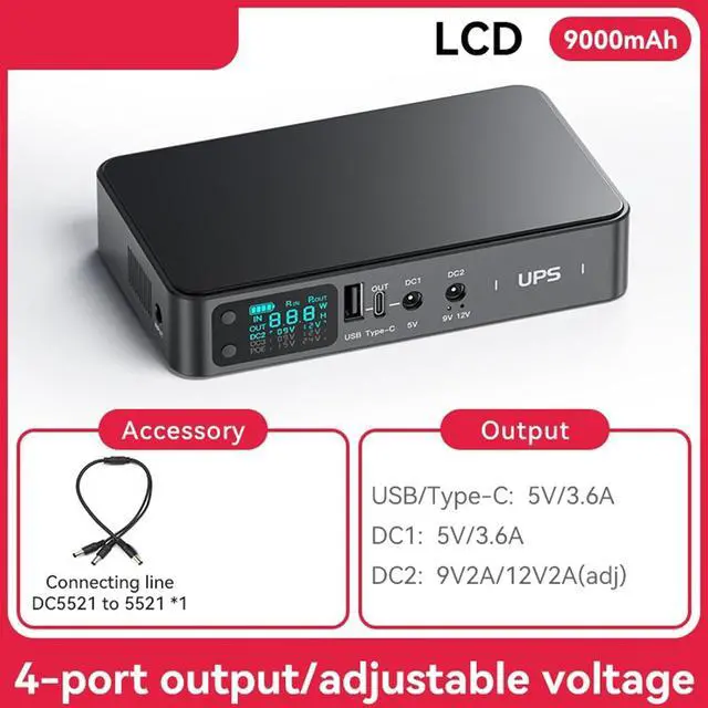 BCIOUS 4-Port Uninterruptible Power Supply with Screen Display USB+Type C+2x5.5x2.1mm Output DC5V9V12V2A Adjustable