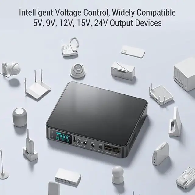 The 18000mAh UPS power supply delivers seamless backup power for routers, security cameras, and access systems. With multiple output options including Type-C, USB, DC 5V/9V/12V, and POE 15V/24V, this compact unit ensures reliable power during outages. Its HD digital display provides real-time system info, and its fire-safe ABS housing with smart circuit protection guarantees safe and consistent performance for both home and office applications.