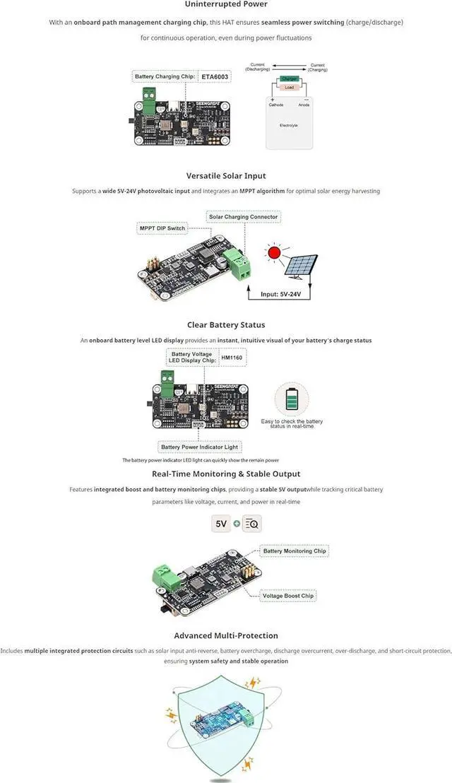 your Rasp-berry Pi stays powered even during input power interruptions. The onboard boost converter delivers a stable 5V output, while multiple protective components