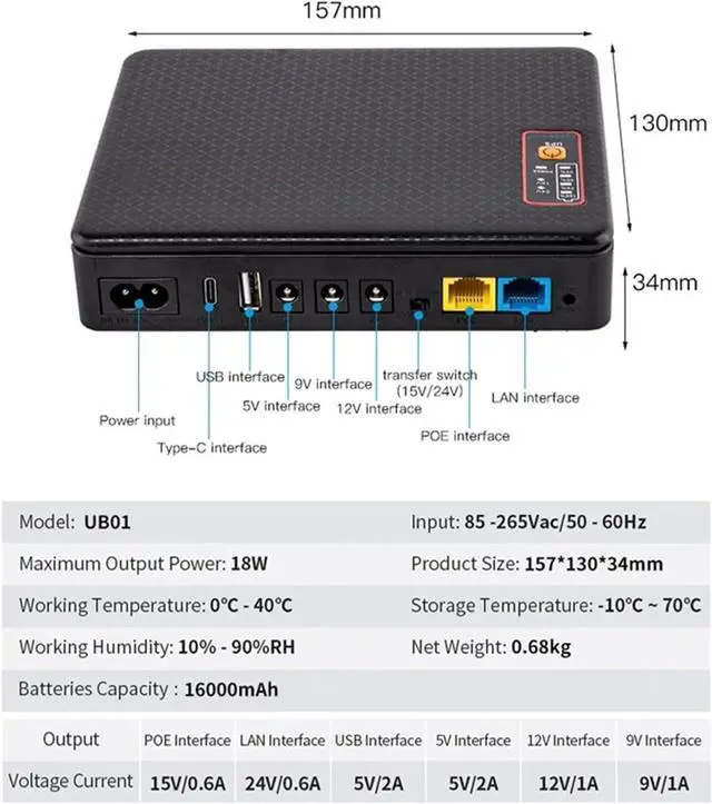 16000mAh Mini UPS Uninterruptible Power Supply with Multiple Ports and POE Switch DC 5V9V12V