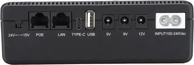 5. Wide Voltage Range: Input voltage of , output voltage include USB 5V 2A, TYPE C 5V 2A, DC 5V 2A, DC 9V 1A, DC 12V 1A, POE 15V 0.6A, 24V 0.4A, with maximum output power of 18W.