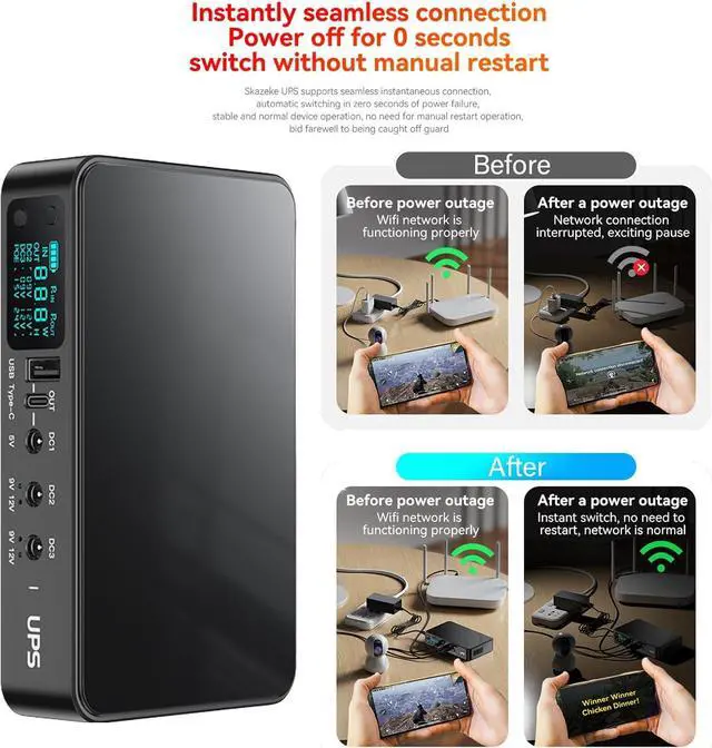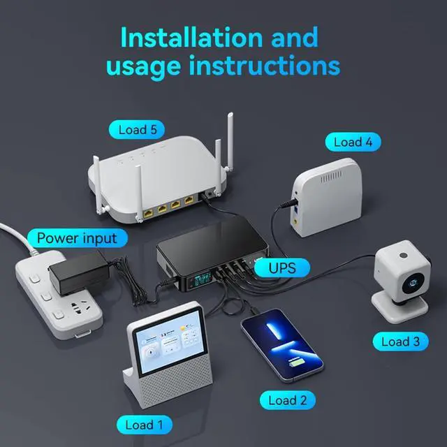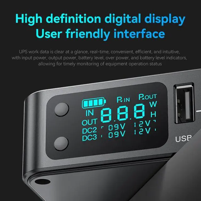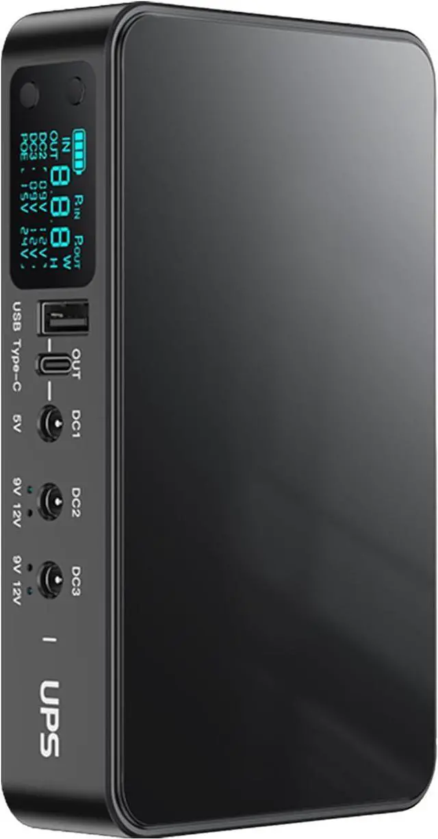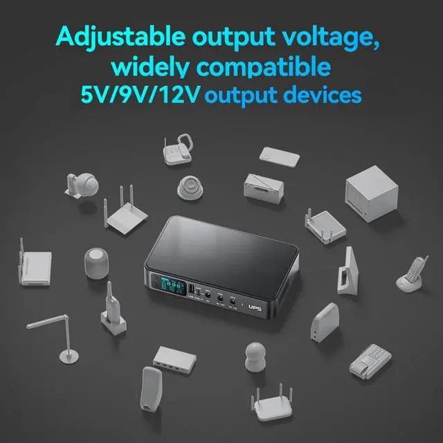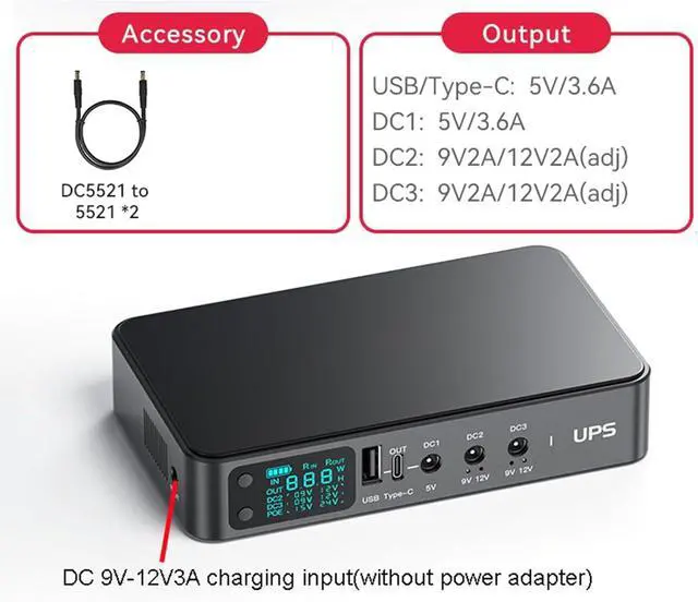 Suitable for reliability, this uninterruptible power supply features multiple outputs (5V3.60A, 9V2A, 12V2A) and USB+USB C port, ensuring stable power for wide electronics from routers to smartphones.