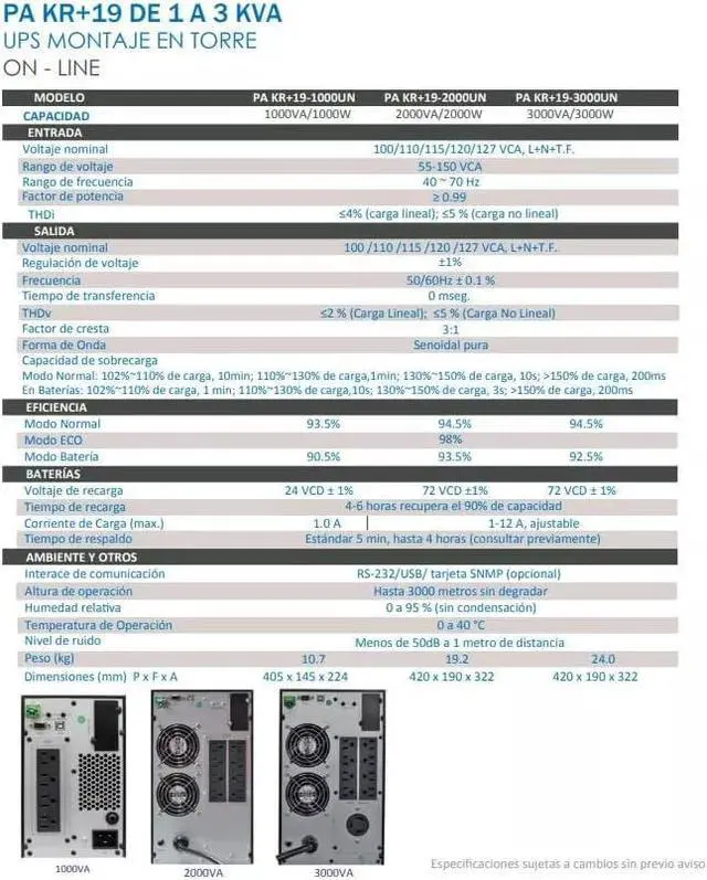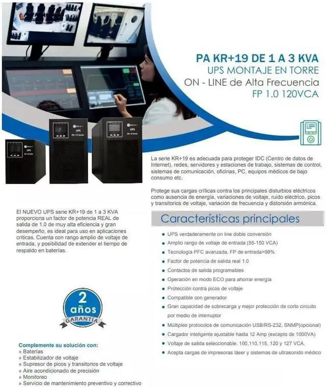 The POWER-ALL KR+19-1000-UN No Break UPS is the ideal solution for protecting critical electronic equipment and systems. With a capacity of 1000 VA, this uninterruptible power supply provides reliable backup against power outages and advanced protection against voltage spikes, fluctuations and electrical noise. Ideal solution for: Home entertainment: Protects TVs, consoles and sound systems. Home Office: Back up computers and routers to prevent interruptions. Medical equipment: Ensures continuous operation of essential devices. Points of sale: Ensures continuity in charging systems and terminals. Main Features: 1000VA / 1000W capacity to back up multiple devices. Advanced protection: Prevents damage from electrical fluctuations. Battery Backup: Provides enough time to save data and power off equipment safely. COMPACT DESIGN: Perfect for offices, homes and medical environments. Multiple connectivity interfaces: USB, RS-232 and SNMP optional.