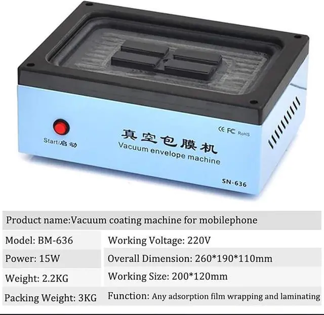 Product information Working voltage: 220V Power: 15W Equipment weight: 2.2KG Packaging weight: 3KG Working size: 200*120mm Overall size: 260*190*110mm Product function: Any adsorption film