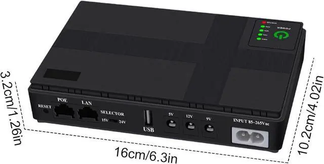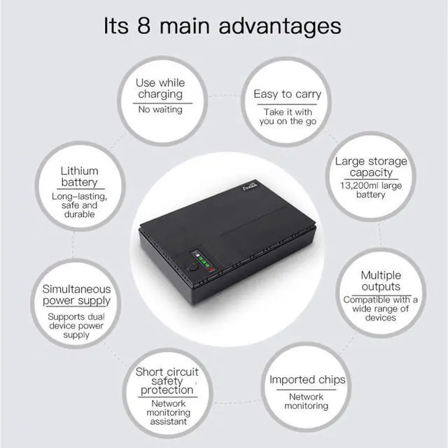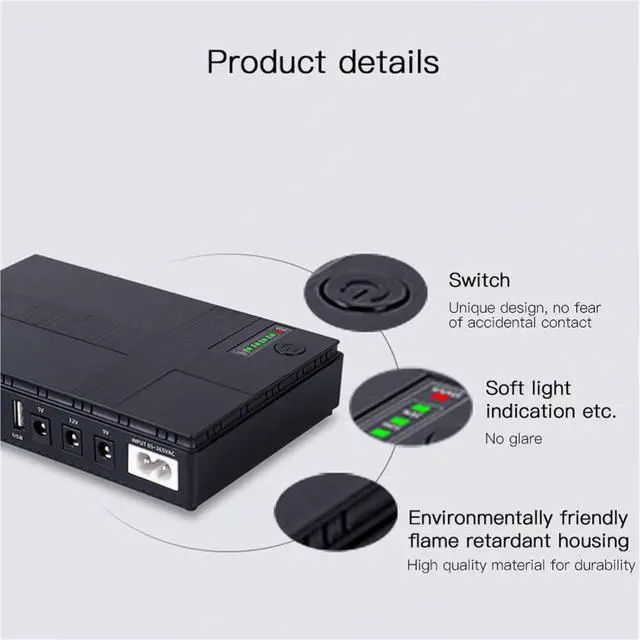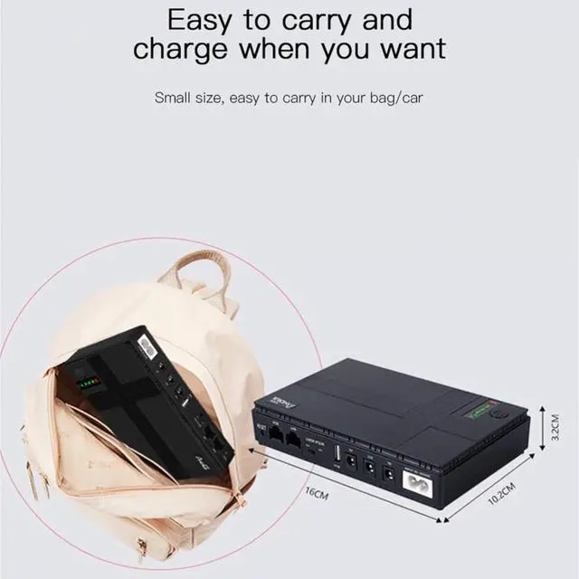 1. The Smart UPS Battery Backup provides a reliable powier source to safeguard Cruciial devices during unexpected outages, ensuring uninterrupted operation for routers, modems, and more.2. From LED lights to CCTV cameras and smartphones, it Offiers continuous powier during powier fluctuations or blackouts.3. Ensure a stable internet connection with the dedicated Uninterruptible powier Supply (UPS) for your modem. Name: Mini UPS Backup BatteryWeight: 400gDimensions: as the picture shownProduct Series:DCDCRouter: UPSpowier Type: Uninterruptible powier SupplyPacking List:1*UPS Backup powier Supply1*powier Cord1*Male To Male powier Cord1*powier Cord1*English ManualNote:Please accept that there is a color difference in the product due to lighting effects and photographing angles.The product size has a tolerance due to hand measurement.