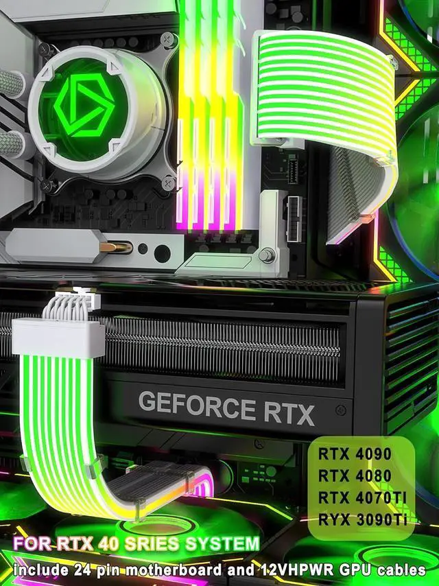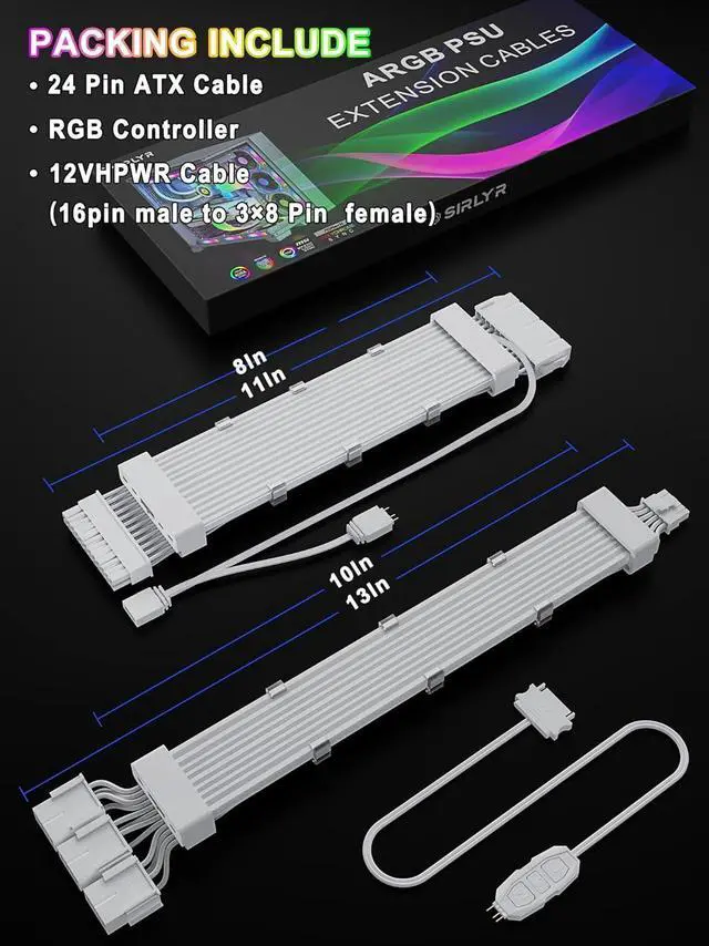 Experience a new level of gaming aesthetics with the Sirlyr RGB PSU cables! Designed for vibrant colors and customizable lights, these cables add a stylish touch to your gaming setup. With enhanced flexibility and easy installation, managing your cables has never been easier. This set includes a 12VHPWR extension kit to connect to the original 8 pin gpu cable,so you don't need to upgrate your power supply to ATX 3.0.16AWG wire core ensure stable performance during gaming. The 12VHPWR RGB GPU cable supports up to 600w output, compatible RTX 4070ti 4080 4090 and 3090Ti graphic cards. Upgrade your gaming computer look with the Sirlyr RGB power supply cables today!