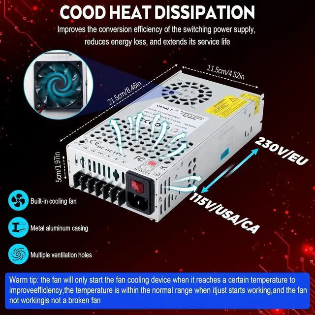 Next page of related Sponsored ProductsSponsoredImportant Reminder: Before use, please select 115V/230V through the switch to avoid damage. Set the switch to 115V for use in the Canada Switching Power Supply Features Technical Specifications: Important Notes: