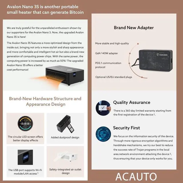 User-Friendly Design: The Avalon Nano 3S is designed to be accessible for both beginners and experienced miners. Its easy to set up and highly versatile, making it perfect for solo mining or joining a stake pool, suitable for various mining preferences in both home and office environments.