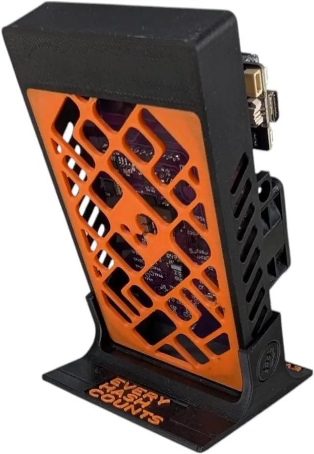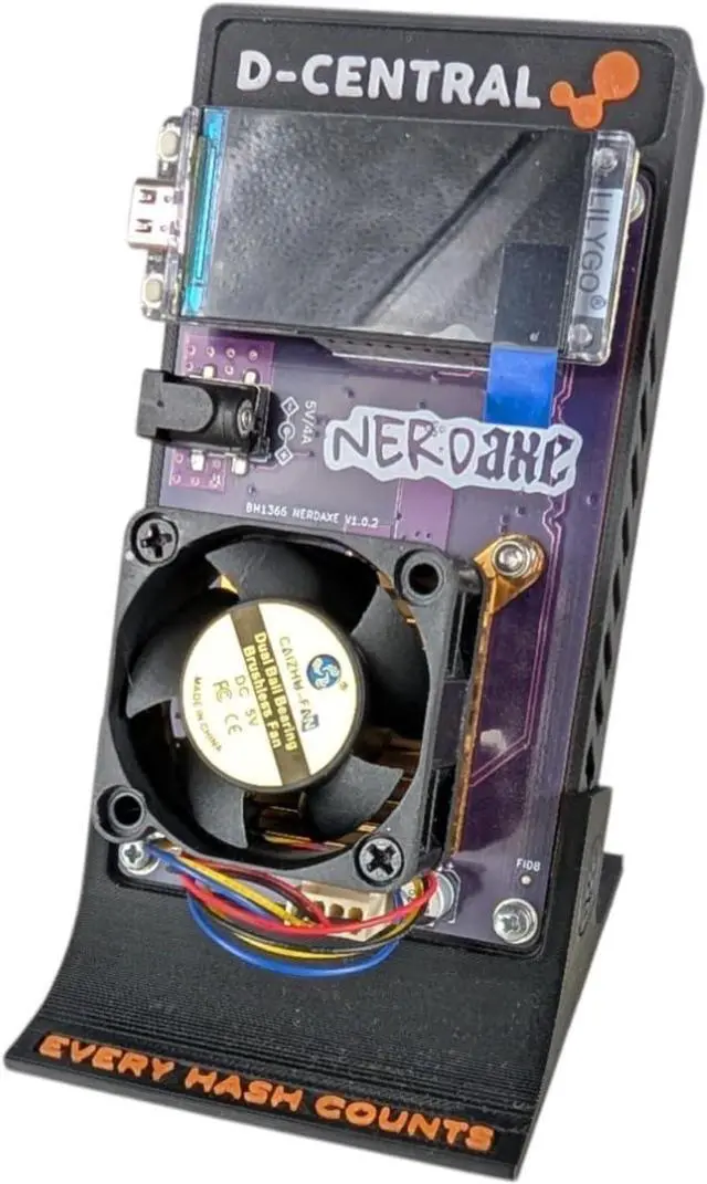 Experience efficient solo Bitcoin mining with the Nerdaxe Ultra ASIC Miner. This compact miner is powered by the BM1366 ASIC chip, delivering a hashrate of up to 500 GH/s with an energy efficiency of approximately 12W. Its open-source design allows for customization and optimization, making it ideal for both newcomers and seasoned miners. The Nerdaxe Ultra features built-in WiFi (ESP32-S3-WROOM-1) for seamless connectivity and a 1.9" full-color IPS display for real-time monitoring of hashrate, temperature, and power consumption. Its advanced cooling system, comprising a high-efficiency fan, ensures efficient heat dissipation and quiet operation, suitable for home or office environments. With global voltage compatibility and a plug-and-play setupincluding a 5V 6A power supply and standthis miner is ready to operate right out of the box. The 3D-printed Nerdaxe Modern Case, designed by D-Central and produced by 3DCentral Solutions, offers dual-orientation versatility and supports an optional second fan for enhanced cooling. This collaboration embodies the spirit of decentralized innovation, providing a reliable and efficient solution for solo Bitcoin mining.