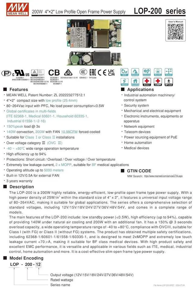 80~264Vac input and built-in PFC, no-load standby <0.5W