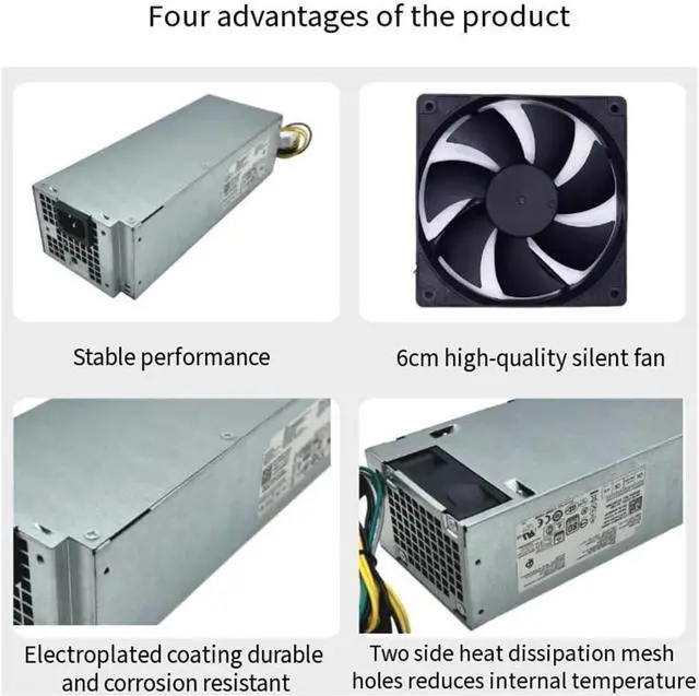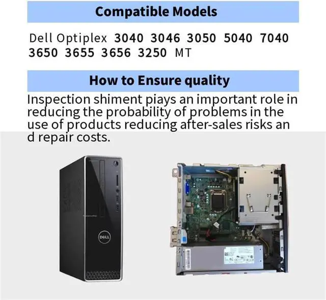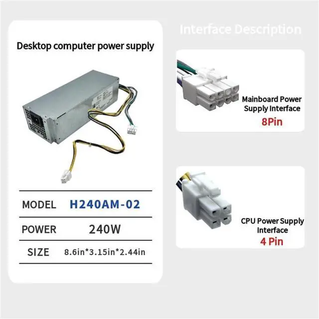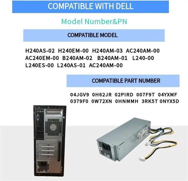 This reliable 240W power supply unit is designed specifically for Dell desktop computers, offering seamless compatibility with various Optiplex and Inspiron models. The H240AM-02 model features both 8-pin and 4-pin power connectors, ensuring proper connection to your system's motherboard and CPU. With compact dimensions of 8.6 x 3.15 x 2.44 inches and weighing 1.63 pounds, this power supply fits perfectly in small form factor (SFF) cases. It's compatible with numerous Dell models including Optiplex 3040, 5040, 7040 SFF and Inspiron 3650, 3656. The unit comes with standard power cables and mounting hardware, making installation straightforward. This replacement power supply maintains stable power delivery to protect your computer's components while ensuring optimal performance. Before purchasing, verify your current power supply's model number against the compatible part numbers listed to ensure proper fit and functionality with your specific Dell system.