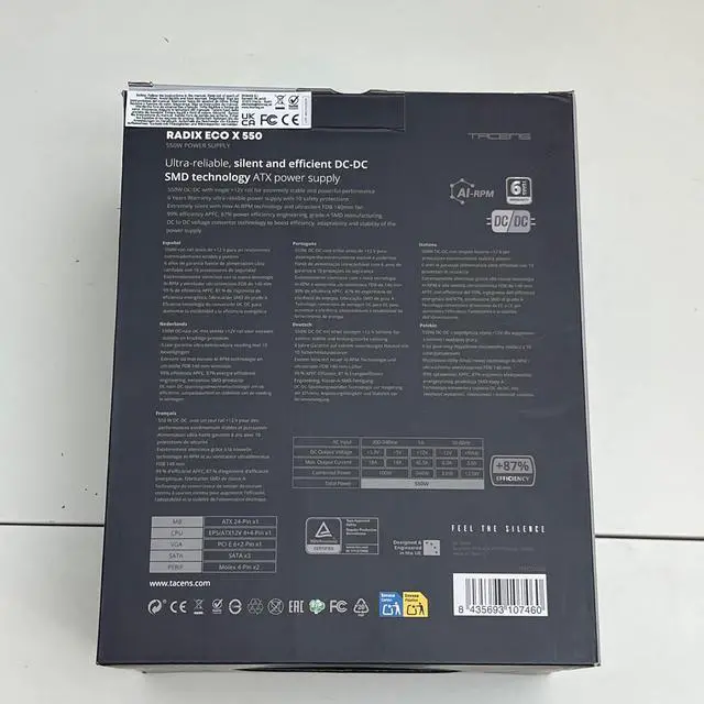 The RADIX ECO X ATX power supply boasts a 6-year warranty thanks to the latest high-precision SMD manufacturing technology, DC-DC conversion technology, double-layer fiberglass PCB, and top-grade-A components for total reliability. Maximum silence with new AI-RPM technology and 140mm XL fan. 99% DIGITAL APFC efficiency, 87% electrical efficiency, extra-long flat black cables, and 10 built-in protection and safety systems.