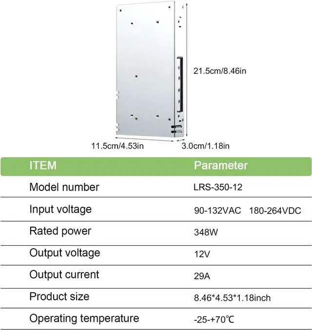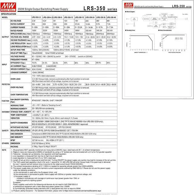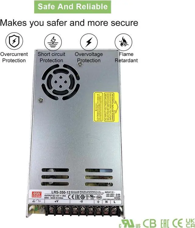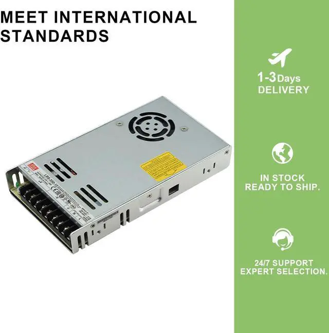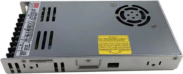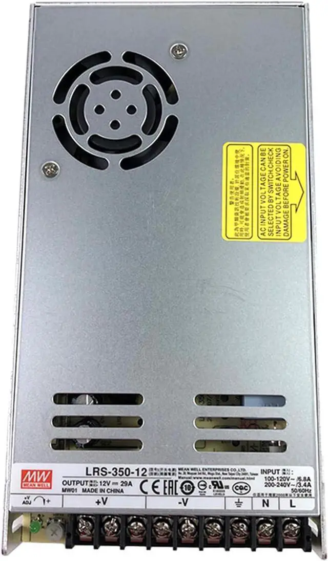 The MEAN WELL LRS-350-12 is a reliable and efficient 350W single-output AC-DC switching power supply that provides a stable 12V DC output with a current rating of 29A. This power supply is designed to meet the demanding needs of various industrial applications, ensuring exceptional performance and longevity. Key Features: Universal AC input / Full range AC input range selectable by switch Withstand 300VAC surge input for 5 seconds Protections: Short circuit / Overload / Over voltage / Over temperature Built-in DC fan forced air cooling Forced air cooling with fan ON/OFF control 1U low profile Withstand 5G vibration test LED indicator for power on No load power consumption <0.75W 100% full load burn-in test High operating temperature up to 70 High efficiency, long life and high reliability 3 years warranty Applications: Industrial automation machinery Industrial control systems Mechanical and electrical equipment Electronic instruments, devices, and apparatus Household appliances Specifications: Input voltage: 90-132VAC/180-264VAC (selectable by switch) Output voltage: 12V DC Output current: 29A Output power: 350W Efficiency: 84% Operating temperature: -13 to 158 Dimensions: 8.46"×4.52"×1.18" Weight: 1.67 lbs The LRS-350-12 is equipped with multiple protection mechanisms, including short circuit, overload, overvoltage, and overtemperature protection, ensuring the safety of both the power supply and connected equipment. Its high efficiency and low no-load power consumption make it an energy-efficient choice, reducing energy waste and operating costs. This power supply is built to withstand harsh industrial environments, featuring a wide operating temperature range and 5G vibration resistance. Its compact size and 1U low profile design allow for easy integration into various systems, while its built-in DC fan ensures efficient heat dissipation. The FerroFab LRS-350-12 is a reliable and efficient power solution for a wide range of industrial applications, offering stable performance, comprehensive protection, and ease of installation.