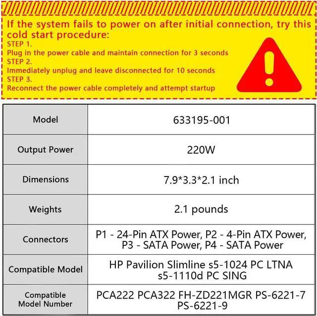 Upgrade your HP desktop with this reliable 220W power supply unit. Designed for compatibility with HP s5-1024, s5-1110d, s5-1002la, s5-1010, s5-1014, s5-1015T CTO, s5-1020, PCA222 PCA322 FH-ZD221MGR models, this power supply ensures stable and efficient performance. With a 220W output, it provides ample power to support your system's components. Easily replace your old or faulty power supply and enjoy uninterrupted computing sessions. this compact unit fits seamlessly into your desktop case. Keep your HP system running smoothly with this essential power supply replacement.