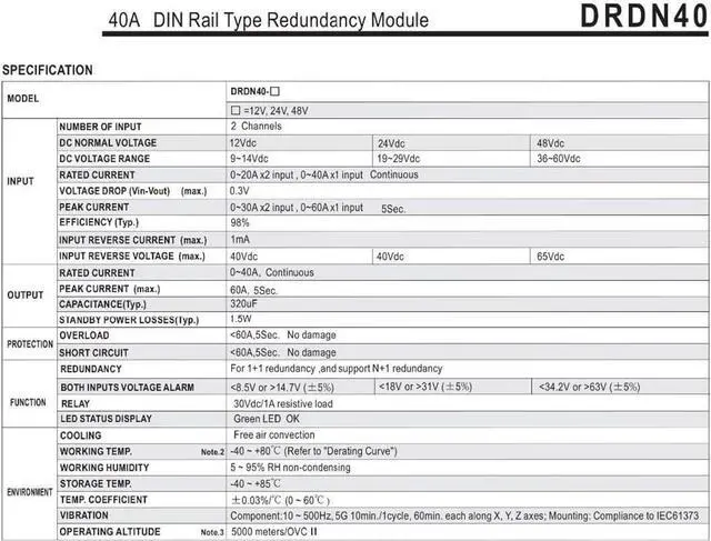 DRDN40-12 12V DC 40A DIN Rail Type Redundancy Module